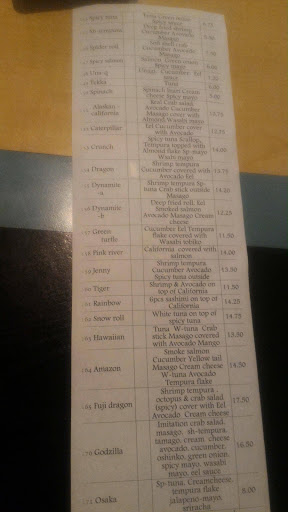 It was my first sushi experience. I decided to take my girlfriend out for her dinner and she likes sushi. Found this restaurant on a google search,and Im very pleased with the result. All the staff was very nice, and the waitress was very helpful with the selection. Good presentation,great food,great all around atmosphere, and the prices are good too! We will definatly be back