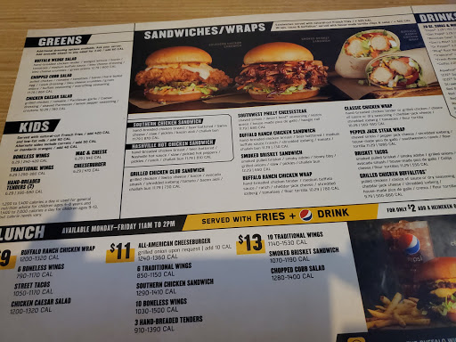 Been here maybe 4 times, loud atmosphere for most of them, not the speediest service but have gotten a consistent blend of Bdubs fattening food (cant not eat them Asian Zing, Honey BBQ, & Caribbean Jerk), good drink selection, and screens everywhere for the games and socializing. Its great to see more menu items popping up - the Big Jack Daddy & Buffalo Blue are on a Red Robin scale of YUMMMM. As well the Buffalo Ranch Wrap (when stuffed properly to bursting) is very tasty. I hope to see more wheat free items and buns - even more hope the prices move back to the $7.50 for a Buffalo Ranch Wrap were back in the day instead of the $9.50 they are now.