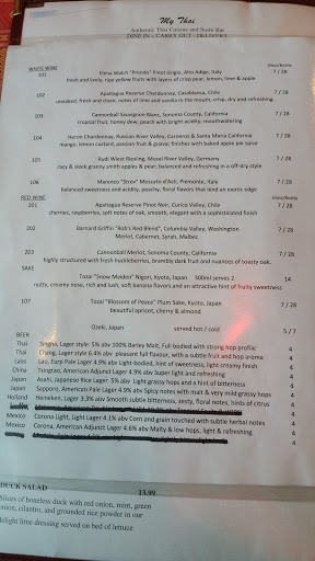 I usually go here for sushi rather than their thai food. The sushi here is always fresh and delicious as well as priced fairly. The chef gets an A for presentation! I have been told that sushi is not always available, depending on the night and/or availability of the chef (Tuesday - Thursday). Better to call ahead to check and see . Establishment is clean and staff are punctual and friendly.