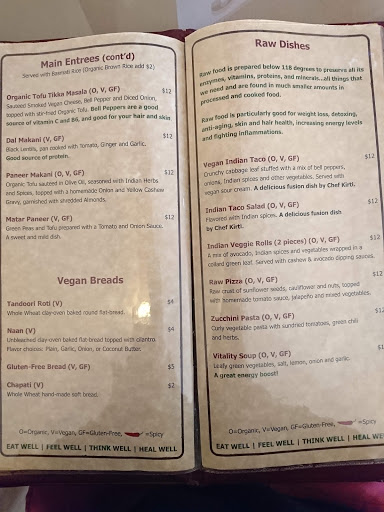 Kirti is a very sweet person and really cares about her customers. We first checked out her restaurant because we bought a Groupon for dinner. She made us feel really welcome, and showed us how to assemble and eat an interesting appetizer that involves punching holes in crispy balls and filling them with deliciousness. We had the buffet and everything was delicious. Even my girlfriend, whos a meat eater and not always huge on vegetarian food thoroughly enjoyed her meal. About a year later we came back for a cooking class on a weekend morning and learned how to make tasty dosa masala, chana masala, and masala tea. Kirti hand grinds all her spices fresh as shes making the food, bringing out the flavors. I went through a really busy period at work where I was skipping meals and not eating real healthy, so I signed up for her meal plan. She provides breakfast, lunch, and dinner at a price much cheaper than eating out all the time. Being able to take the stress out of grocery shopping and making meals when I was burning the candle at both ends was a huge help. I always had a yummy healthy meal waiting for me in the fridge, and didnt have to run and get fast food as I was running around. She provides smoothies for breakfast, salads and Indian pancakes for lunch, and a variety of curries and hearty stews for dinner. My favorites are the sautéed cabbage, the chana masala, the black lentils, the lentil soup, and the curry sweet peppers. She even got me to like cauliflower, a vegetable Ive never liked before. Although my main reason for signing up was convenience, I also lost weight - about 10-15 lbs over a month. I highly recommend her restaurant for dinner, her cooking classes, and her meal plan, for both vegetarians or meat-eaters looking for a healthy, tasty meal.