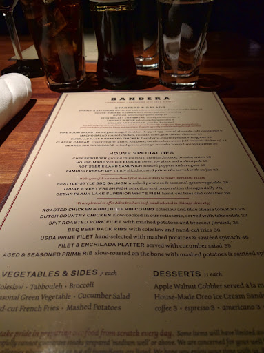 Updated!!! Like I mentioned below, I rarely write reviews. I would also never have the expectation that Id get a call by the manager of the restaurant. My phone rang today at I got the pleasure of speaking with Alana about my experience. She explained the waitress we had was new. I told her we definitely did not take it personal that we didnt have a great experience because it wasnt 100% her fault and I truly believe you dont take it all out on one person. Ive updated my review to 5 stars because I know they are doing what they can to make it right! Thanks Alana and I look forward to giving Bandera another shot next time we come into Chicago. ------------ I rarely write reviews... Maybe a couple a year and its only when I feel one definitely needs to made. Im writing this one immediately after leaving. I give this place two stars because of the overall experience. Went for our anniversary. Got seated at a small booth even though tons of tables were open by the windows. It was fine. Cozy. Immediately it was freezing so I switched places with my wife so she didnt have to wear her coat inside. The lady said, without us asking, that she asked the manager to turn it down. Great! Ordered the highly recommended corn bread. Waited. Air never went off. After 20 minutes finally asked to move tables... There were still several tables open, and had been open that entire time. Waitress Nicole B was very nice and asked, but evidently there werent any seats and there was a wait so she evidently asked the manager to again turn the air down. I dont doubt she asked, but during the entire hour it only went off for maybe 7 minutes. She did offer hot tea to my wife... Nice, but doesnt fix the situation. Oh, heres our food. Never got our cornbread. I asked and the guy said he is sorry and hed get one on the house. Wonderful but bread coming after you get your main course and have already started isnt all that appealing. The tuna salad my wife got was wonderful. My prime rib was good. Crust had great flavor but the meat looked pretty butchered. I was confused getting asked how Id like my prime rib cooked and my wife getting asked how she wanted her ahi tuna cooked, but maybe thats a northern thing. At the end of the night, only an hour after starting because it was cold and I wasnt enjoying the experience, we got our check and left. Most people wont have this experience, but it was a drag. It was our last not in Chicago, it was our anniversary dinner and I was looking forward to a nice evening out... In fro, the cold.