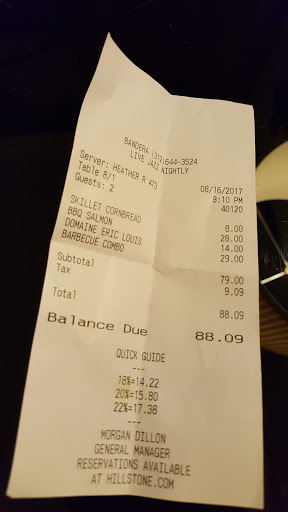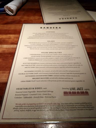 Three stars for the restaurant, one star for the music. As often in the US there is quite a fuss about little. We had a Cesars salad and chips with spinach dip as starters, which were both really good. The cheeseburger and vegetarian-burger were quite good as well, but nothing more. We ended the evening with a bill of around 110 USD (including two beer and a bottle of sparkling water). The ambience was exceptional, the live music as well. If ambience and music are taken into the math of the 110 USD than its quite a fair price. If we had to pay only for the food, it might would be way too expensive. Choose Bandera for the live Jazz music and the beautiful ambience, food is good average but not exceptional. Our waitress was very kind and attentive, although we Europeans emphasise the removal of finished plates before all on the table have finished their meals as unpolite and not adequate.
