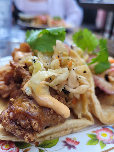 Went here on holiday weekend, Sunday evening around 8pm. The location was great. Easy to find and the music was bumpin. We were seated right away, but they were severely understaffed. The party to our left was seated before us and our two groups waited for 10 minutes before being checked on. My party got our food quickly but we had to ask for waters 3 times and they arrived after the tacos. Two people shared a family style platter of 6 tacos. We had two of the carne asada, two of the fried chicken tacos and two of the pork belly al pastor. Firstly, the "charred" items that came on the tacos were not charred. Especially the pineapple which was cold. The pork tacos had a lot of grease and the fried chicken tacos had unequal portions of chicken. The tacos all tasted fine, but I would not pay the regular price of $8 for two. If I were you, Id go during their happy hour when tacos are $2 a piece. That seems like the correct pricing. Overall, disappointed with the service, but I recognize that they were understaffed. The tacos were fine but I wouldnt go back.