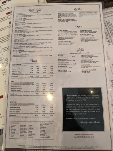 Ive eaten at the restaurant a few times and the food there has always been EXCELLENT... Pasta, chx, beef, seafood.. Large portions, cooked to perfection! Some of the freshest/well cooked calamari Ive ever had! Ive never tasted one dish served at the restaurant that wasnt sublime!! My mouth waters just thinking of those meals! As for delivery... For one who was raised in Chicago and hv lived here most of my life.. there are a few Chicago food staples that I am a CONNOISSEUR of.. Pizza and ribs being two of them.. Calos thin crust pizza is one of the BEST in Chicago (and thats a TRUE ringing endorsement!) The stuffed pizza, on the other hand, was a terrible disappointment. Way too much dough, not enough stuffing. And the ribs, while cooked to perfection, had one of the WORST sauces Ive ever encountered. I will never order either again. With the exception of those two caveats, the fare here is not to be missed. I anxiously look forward to eating at the restaurant in the near future!