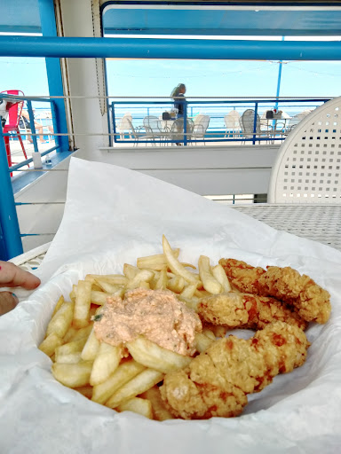 It has a nice view of the lake and beach from the top. The food is bar food, good for a day at the beach but quality left somthing to be desired. Service wasnt good. We ask for water and were told to get it yourself at their water station. Ordering drinks too took too long to show up.