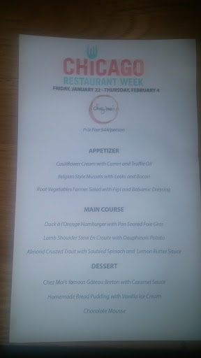 Went here last Saturday with another couple and had a great time. BYOB is awesome, parking is easy on the street or is very close to the brown line or metra. Inside is cute and the staff were overall, very nice. We had the duck, steak frites, and creme brule. 1. The duck was amazing and so well portioned for the price. 2. Steak frites were solid, but Id say just a hair on the side of too done for a medium rare steak and 3. the creme brule was amazing. Only off part about the night was when our entrees came out one was wrong and while it took us a few minutes to flag someone down one of the runners said "oh this is the wrong entree isnt it!" and he quickly switched us out, so Im assuming there was just a mix-up. When the waiter came around to apologize he more or less blamed the runner. Fine, no biggie. Then we put in our dessert orders and the wrong dessert comes out again (for the couple we were with) and nothing was really said about it. I just find that a little annoying, but hopefully those kinks are worked out soon.