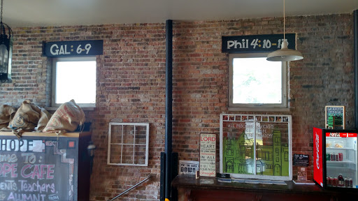 this is an awesome café. fresh high quality beans locally roasted. expert friendly baristas. a beautiful space in refurbished old stone building - large space. perfect internet café setting for casual hangouts w/friends or for posting up and getting work done - hook in spot for meeting with clients, or just hang out with your computer or a good book. and, all proceeds / profits go to Hope Academy, an inner city private high school for inner city students - high percentage of ethnic students. this is an awesome café, high quality coffee, and your dollars go to a good cause.