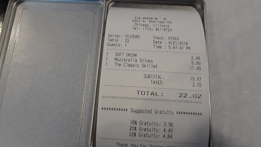 The new Clarkes in Rogers Park is fantastic, a great addition to the neighborhood! I have gone to the original restaurant in Evanston for many loyal years, but this new Clarkes is now my favorite -- it has a great atmosphere indoors and a large outdoor seating area right on Sheridan Rd., which provides a great combination of people-watching and privacy. The waitstaff is wonderfully friendly. The Monte Cristo is my favorite. Great burgers too!