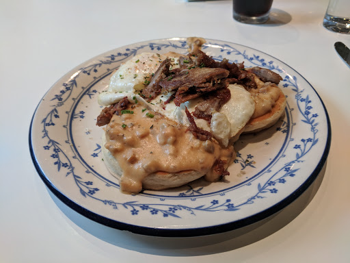 I came here on a whim after church last Sunday for breakfast. I walk by it all the time so finally decided to try out my first French brasserie. The interior is quite nice and had a lively, brunch-like atmosphere even though not many people were drinking. We were seated immediately near the pastry display, which contained dozens of various donuts, croissants and other bread products. I took the waitresss suggestion and ordered the corned beef hash with a side of bacon. The cocktails were all $12, so I decided to just get a coffee and save the drinking for later. There was only one waitress in our area (or maybe the entire restaurant), so the service was a little erratic. After forgetting my coffee at first, and then the cream after that, I finally had my drink by the time the food came. The corned beef hash was savory but not extremely flavorful, however the poached eggs I ordered on it were nice and runny. The bacon was thick and crispy, but I couldnt help but with it was the jalepeno bacon at 25 Degrees. Overall, this place is a nice place to stop for an expensive, sober brunch downtown. However, if you want a boozy brunch I suggest you look elsewhere.