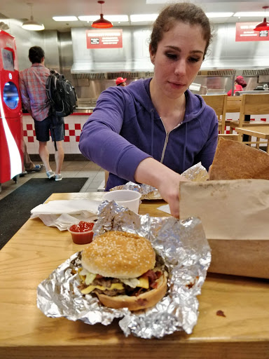 Such a guilty pleasure. You cannot have Five Guys more than like once every few months, at least I cant. If I did, Id be riddled with guilt from all of the calories I was consuming. If it came down to it I could sit there and eat fries and cheesy, bacony, burgers all day long!! The service is great there. Everyone is so nice and they are so quick, even at their busiest time.