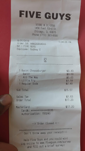 They love to get your order wrong and try to fix it by throwing extra fries in your bag. If they can get your order right, the food is excellent. Very high prices tho. But yea, five guys.