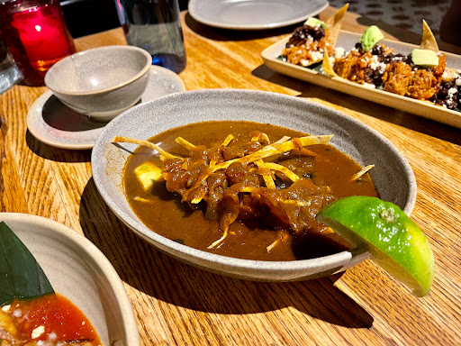 Went here prior and it was awesome, and went here again last night because a good friend from out of town visited and I had to show him this place. Still awesome! Both of my visits here were for dinner, so I cannot comment on the brunch and lunch. The place is pretty exotic-comfy, nothing way over the top in decor, but a lot of interesting artwork decorates the place. Tables are kinda close to each other though. Service here is some of the best in town; best service for the price of the food by far. As a party of two, we started with the oysters. Yes, oysters at a Mexican restaurant isnt common, but do have them here, as they are great. My friend was definitely delighted by them as we both shared a half-dozen! Oysters come with a tomatillo and habenero mignonette sauce and chipotle garlic salsa (and of course, limes!). Next we had the Frontera ceviche. Albacore + olives + tomato + cilantro + green chiles + lime = mouth orgasm on tostaditas. For entrees, my friend had the Mole Trio - two enchiladas in a poblano mole, vegetables in a green peanuty mole, and pork and beans in a savory chocolatey-spiced mole. I definitely will try that for next time, but it looked great and he loved it. I had the Saturday special, the Costillas, or ribs. Very tender and juicy ribs with a spicy chipotle sauce. Very tasty! During all this, I had my fair share of the superb magaritas suggested by our super friendly waiter (Friend just had one and water the rest of the evening). Portions are very generous, so we got to go home with quite a bit of yum that my roommate ate up and enjoyed. Love Rick Bayless and his awesomeness is reflected in the food. A must-try if you are ever in Chicago!