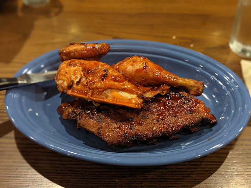 Ribs fall right off the bone..... Yes, but if the meat has no flavor then whats the point? But you say its the BBQ sauce that makes the meal.... Well isnt that the same as eating the celery stick mearely as a conveyance for the peanut butter?? Please do not make the mistake in anticipating mouth watering smoked ribs because as the menue states right under the"RIBS" section under the "Full Rack" and the "Half Rack" in the whimsically named "Porkapalooza" section "try a sampling of our applewood smoked pork". I thought, simply enough, why try a sampling, lets go with the full meal deal!! So I ordered the ribs and BBQ chicken. When the waitress brought it to me, my olfactory could not detect a hint of true smoked bbq. She asked how it was and, trying to disguise my disappointment, I responded with the question: " this is supposed to be smoked?". To this she replied, yes, they smoke it. I continued allowing the meat to fall off the bone and into my mouth at this point searching for perhaps a whisp of smokiness.... Even if it came from Jose, sneaking a few puffs off the Marlboro Man at the back door..... Still nothing... My waitress then re-materialized at my table and informed me that no, in fact only the pork was smoked.... Errrr.... I know that Im only a farm boy in the big city, but baby-back ribs are also closely identified as being a pork product.... And though I had a full dissertation on the origions of bacon, chops and sausage mentally prepared to shock and awe the crowd with, I chose not to embarrass her.... In the end, I only ate a portion of the ribs and chicken.... asked for my forty dollar bill and left..... Now I know there have been several people raving about the ribs on this review, and not to belittle them, but if its true slow cooked, smoked BBQ youre looking for, please dont be disappointed when you receive super tender, fall off the bone, baked, taistless meat disguised as real BBQ.