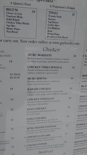 Staying at a hotel one block away and decided to try for some variety. The Gaylord name carries some weight and the online listing seem to indicate it was associated with the old classic in California. Well, the name is the same but the food aint. Decent looking place. Service was fine. Wine list pretty bad, although they do carry an Indian line of wines which is novel. I wouldnt recommend them but it was nice to see it on the menu. They had an extended list of martinis and cocktails, which maybe is what I would do next time (cocktail and snack food). Menu is pretty broad, with a good variety of snacks (bhel puri, etc) plus north Indian stand-bys like samosas and pakoras. They also have some samplers for $10. Samosas were decent; crispy if a tad oily, with some spice. Chutneys were watered down but decent, and they did provide what looked the the standard Bedekars mango pickle which was very helpful. Good selection of normal north Indian fare plus dosas and other south Indian. Also good selection of thalis. Prices for thalis are good for the amount of food you get... like $20 for the vegetarian that included soup, two subjis, dal, rice, raita, naan, which was enough food for two truth be told. Of course, where it counts is the food and I wasnt impressed. The food was pretty bland and non-exceptional. Add salt and spice and it was tolerable, but it really isnt worth a trip given there is very good quality Indian in Chicago. My advice is to find some place else.