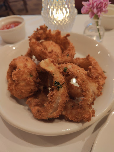 We always talked of going to Gene and Georgetti. We wanted a steak dinner late afternoon and to our surprise they were the only steak house serving at that time. We were delighted with our visit. The ambiance was great with the dark wood walls, reminiscing a time past, a relaxing atmosphere. The place filled up as time went on. There were businessmen, people planning to attend a Bulls game, a family holiday gathering, and others. We preferred the main room with the bar rather than a cooler temperature back room with a huge mural. The wait staff, all male waiters, were very attentive and not hovering. I had ordered a filet with no seasoning and was told that the steaks were not seasoned. I love being able to season my own rather than having the taste covered with seasonings not to my liking. The filet and strip steak (which came with their own steak fries and a simple salad, not a la carte) were the real deal, prime meat cooked to perfection. By the way, a la carte is the rule at most Chicago steak houses. So another nice surprise there. And a glass of their inexpensive cab was surprisingly very good! For dessert we shared a classic, crumbly cheesecake reminiscent of a bygone era. A bit off the beaten track, but well worth it!