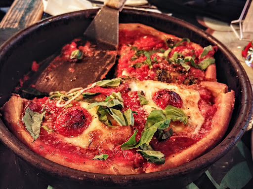 Im a total lover for deep dish pizzas. In regards to the taste of the food, Id give it a 4 out of 5. The pizza tasted like it was not fully cooked. The dough felt soft, and so did the thick crust. All in all, I waited about 50 minutes for the small size pizza, which is fairly normal for deep dish. The price and service gets a 2 star, but the waiter who spilled beer all over me and my camera equipment and doesnt even apologize? Im not even sure how to rate that.. Also, in regards to the design of the restaurant - this is probably the most non-ADA compliant restaurants I have ever visited. There are no ramps for the 3 huge stairs, nor is there a door assist for the two front doors. More importantly, there is literally nowhere to put a stroller or a wheelchair unless you park it up front or leave it outside.