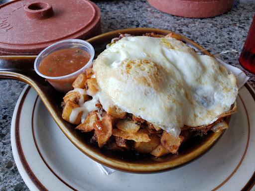 Has a pretty great $7.99 combo Mon-Fri: two eggs, half a plate of homestyle hash browns, two pieces of sausage or bacon and 2 huge pancakes. Its way more food than the menu suggests