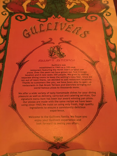 I attended Northwestern in the early 1908s and frequented Gullivers way back then. It was the best pizza I had ever tasted! Since then, I have been living in Michigan for the last 26 years and dont get to come over very often. I did come back last month for our classes 30th homecoming celebration and stopped by Gullivers again. The pizza is still the best I ever tasted! It was like traveling back in time - it seemed like nothing changed! The great staff, awesome décor and wonderful pizza was the perfect cherry on top to a wonderful weekend. To all deep dish pizza lovers everywhere --- YOU MUST STOP BY GULLIVERS!!!!!!! Keep up the great work and every time Im in Chicago, I will make it a point to stop by Gullivers!