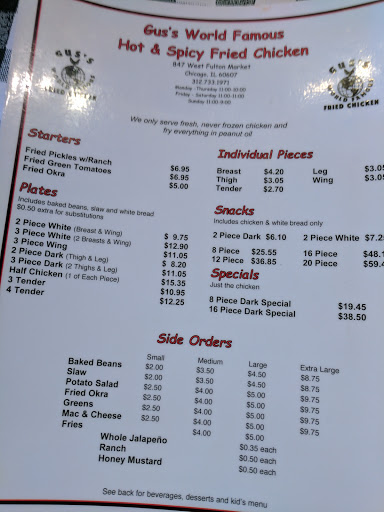 Chicken so juicy, tender, and with enough kick in the spices to really let you know that Guss is world famous for a reason. Decent sides and starters (I tried the baked beans, mac n cheese, and fried green tomatoes) but the chicken is the real star here. Hands down the best fried chicken Ive had in Chicago.