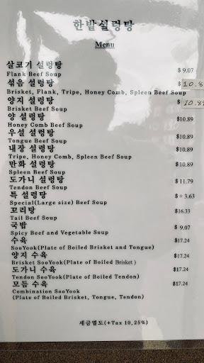 Cash only. Which I didnt know so didnt have any cash on me. (No sign, no nothing) So I had to look for ATM all around gas station/ liquar store and more. (They had ATM but out if service and no cash back) I found one place call Harvestime Food near there and used their ATM to get some cash. I came back to pay for the meal and gave her small amount of tip (didnt want to give her tip regularly) but She asked more tip. (Why does all Korean Restaurants do that? Seriously). And food wasnt best. I ordered two Sul Long Tang and one Soo Yuk(briscket and tongue). Soo Yuk was same as Sul Long Tang with less soup and more meat. I thought the meat would be more thicker (which normally does) but it was same as meats in Sul Long Tang. No reason to order separate dish. Will I return? I dont think so. I know better place called To Sok Chon. Food basically same but only difference is Han Bat is beef, To Sok Chon is pork. Better service, better taste, better food. Price To Sok Chon is about a dollar or two more expensive but reasonable. You guys should go there and try Soon Dae Gook Bob or DoeGiGookBob. Much better
