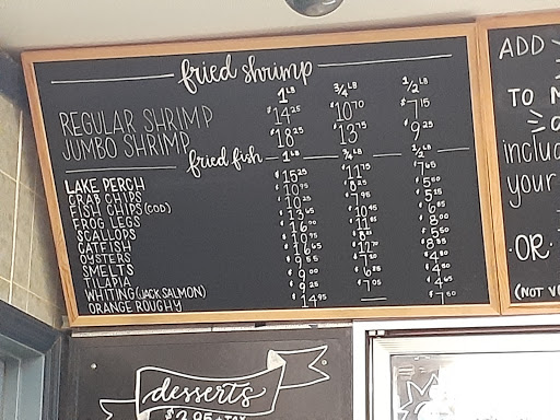 Friendly service, fish is always fresh. Tasty, just plain excellent food. Cole slaw, potato salad delicious. Cake slice was a disappointment. Prices overall are decent.