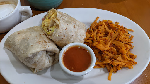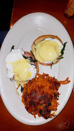 I came here with some friends for Sunday brunch- we wanted to sit outside since it was a nice sunny day but the wait was pretty long. We only waited 20 minutes to sit inside. Wait staff was friendly and prompt. I had the turkey burger on a pretzel bun and it was really good! Turkey was fresh but I wish they didnt mix the toppings with the patty (mine had broccoli and mushrooms). This place is known for its sweet potato hashbrowns. I didnt try them but my friend told me they were too mushy. I had the sweet potato fries- I really liked them! Portions are good too- I didnt have leftovers so it came out great.