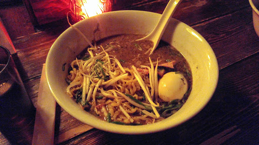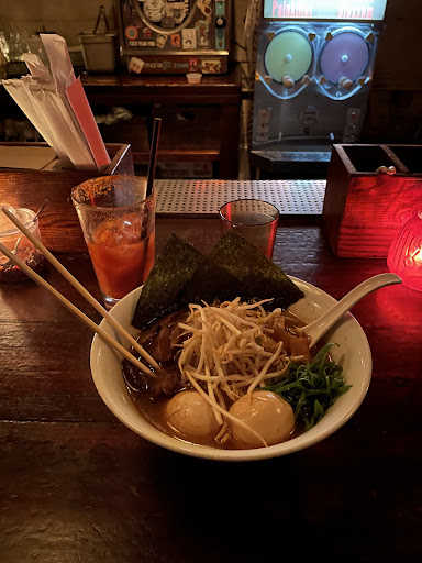 They are currently closed on Sunday & Monday. Days they are open, they stay open until 1am for food, 1:30am last call for drinks. I had the Demons Club ramen. Its a bowl of ramen bathing in spicy, fairly thick broth (like slightly thin gravy viscosity more than soup broth) so order it if you like very spicy meal worth of spice. The spice has a lot of heat but does not cross over the line of being heat only. I was able to taste the flavors and the ramen noodle. The two thick slices of pork was buttery tender and very flavorful on its own. The boiled egg, to my delight, was soft boiled. Perfectly. The one beer on the menu is a liter can of Asahi, aka "Canzilla". This went very well with the spicy bowl of ramen. Dont worry about the volume. Youll sweat out the alcohol during the meal.
