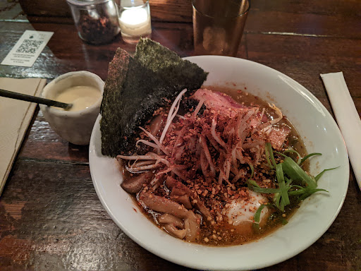 After reviewing all of the ramen places I could find through social media this one looked like a winner. We did not come in with any preconceived notions of what ramen is or isnt we (traditional or fusion or du jour). The ratings were high and the pictures looked good. It was a little tricky finding the place as the street number wasnt visible and the door is located in the outdoor seating area of another restaurant. We asked the valet across the street and he gave us directions. The place is small and dark. We had to wait about 30 minutes for seating and they texted us when the table was ready. The host/server was efficient and friendly. We both ordered the same ramen (there were only four choices) I think it had sho or cho in the name. Either way it was absolutely delicious. There were a couple of slices of pork which were tender and flavorful. Probably could have shared one bowl it was that big. We ordered with half spice which was sufficiently hot anything more may have overpowered the ramen. A great dining experience.