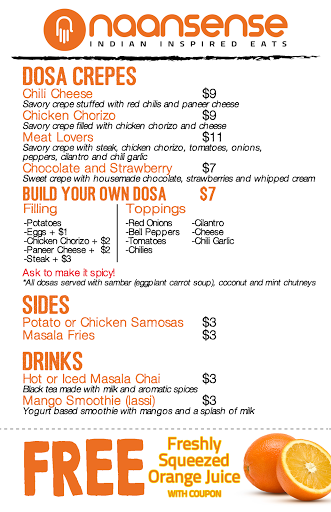 Naansense is now serving brunch on Saturday from 10am-2pm. They will be serving dosas, samosas and mimosas! Bring in some champagne and they will have freshly squeezed OJ! Brunch Menu: Masala Potato Dosa, Chicken Chorizo Dosa, Chilli Cheese Dosa, Egg and Cheese Dosa, Spicy Masala Dosa, Chocolate and Strawberry Dosa!