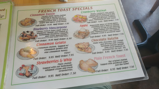 Ive gotten the traditional pannekoek and the thick challah french toast and I am going back for more. This restaurant is a very tiny enclosure (hole in a wall?) that serves up great breakfast foods. The hours are very breakfast-centric and the entire menu is breakfast, but dont let that stop you from eating at this great cafe. The food is superb, but the small room docked it points.