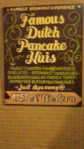 Unique pancake place. Giant flat Dutch pancakes. Great quality food. It is very small, so expect to wait, but its worth checking out. Cash only, I believe. The orange juice, while pricey, is worth it.