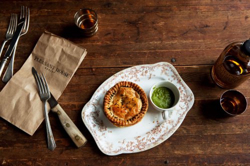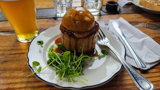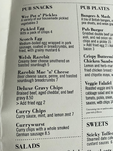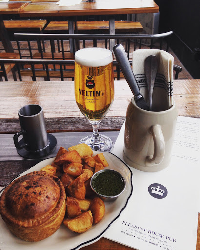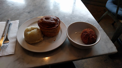 A very good experience. We had lunch on a Saturday afternoon and got seated immediately. The ambiance had a very cozy and British feel but in an updated and modern way. The service was friendly and attentive. The beer list is small and very curated (but it would have been nice if it was rounded out with a few run of the mill local options in case I can ever wanted to bring my dad to lunch here). We got four different pies (3 of them crowned with mashed potatoes and gravy), minted peas, curry chips, and a Scotch egg. The peas were completely unremarkable. The Scotch egg was ok. The sausage in it was good and the egg was nicely cooked, but the thing was over-fried to the point where the breading tasted a little charred. The curry chips on the other hand were awesome and definitely worth revisiting. The pies (mushroom kale, premium steak, beef and ale stew, and some curried chicken pie) were beautiful, satisfying, and although at points very salty, for the price and the ambiance they were all good. More specifically, the sauces were great and the chunks were tasty and generous, but the pastries were a little too thick and chewy sometimes and I felt the pies werent really thoroughly re/heated. None of these things were deal breakers though and overall it was a great lunch.