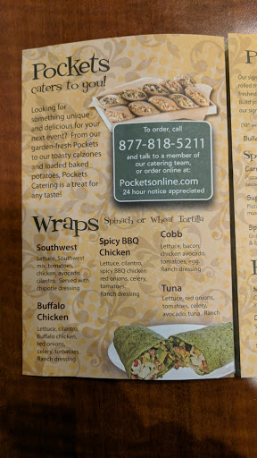 Pockets is really good. I always order online and the food is always on time with the receipt time. Ive never had a bad experience here and I love the Southwester Chicken Pocket. its definitely a lot of different things on the menu to choose from including the Turkey Chilli as well. I go here at least once a week if not more.