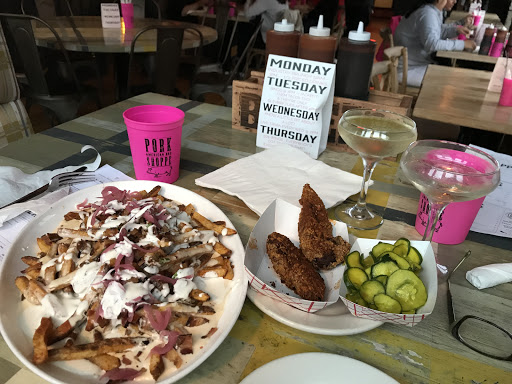 Being big BBQ aficionados, we decided to hit up Pork Shoppe – we live right down the street and have been to everything but this place and BOY have we been missing out. The ambiance of the restaurant is hipster-ish, cutesy cartoonish and rustic, all in one. I am blanking on the waiter’s name (man bun, he’s a distinct man) – who was an absolute joy to have serving us. He explained the menu and details of the meal even if we did not ask. I ordered the BBQ tip with Mac n’ cheese (I will cater this exact one at my wedding, I swear) and fries (you will not find this kind anywhere else, I promise you. My boyfriend got the ½ rack ribs and beans and cornbread. We tried both and were more than pleased with our, and one another’s meals. The meat is slow-cooked and so tender, it melts in your mouth. They have a great three-option sauce: sweet, spicy, and tangy. I mixed the spicy with some mayo and it was delicious. I also have the Apple Mimosa which has apple cider (for fans out there) with cinnamon in it. Dangerous: Does not even taste like alcohol. Would we come back? Again and again, maybe even tonight. Extremely affordable, tasty, and great staff. GO.