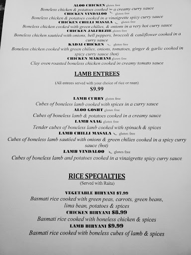 The Malai Chicken Masala is heavenly! every time Im here I NEED to order that. The breads are very fluffy and soft. I love the food here Although I dont understand why people complain about the "Indian standards", Im an Indian and I love their food. Everything is delicious and flavorful!
