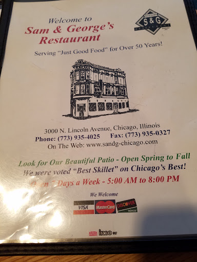 Sam and George has been around in Chicago for a really long time, and theres a good reason why. The food here is reasonably priced, served in generous portions and tastes really good. As a far as american diners go, this is one of my favorites. I had the breaded veal cutlet, a house specialty according to the menu. It came with a salad, soup and made for a very satisfying meal. The veal cutlet itself was a little dry on the inside, but not terrible. The fries were really well done, freshly cut and fried. The food did take a while to come, even though our server was really quick in seating us and taking our order. So if youre in a rush or about to collapse from hunger, do let them know and the friendly staff there will do their best to ensure that food appears on your table quick. Also, the prefer cash so have some handy as well.