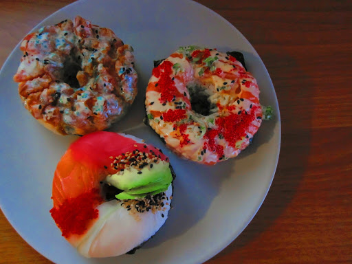 So I bought Sushi donuts from Simply Thalia. Not sure what I was expecting. They tasted like sushi, which was good. However, they did not taste like donuts. I used a fork and a knife to cut them up and eat them. Anyway, it was an interesting experience.