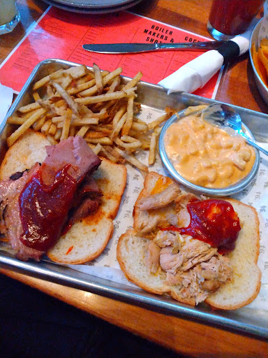 Not anything to write home about. We ordered, the smoked jalapeno cheese, smoked wings, smoked chicken, smoked brisket, mac and cheese, homemade bbq chips and the fries. the smoked jalapeno cheese was interesting. At first it was pretty meh, and then was a bit addicting as you continued to eat it. I didnt eat the smoked wings, so I cant review those. The chicken and brisket were decent. Mac and Cheese was good, chips and fries were good. The sauces though were mediocre at most. They had an original style which was like KC style, a mustard based one, and a Chicago bbq? The mustard based one was by far the best, with the kc style next. The chicago one was essentially sugar with molasses and more sugar. I didnt know chicago had a style of bbq so Im not sold on this. Basically its a sweeter kc with more molasses.