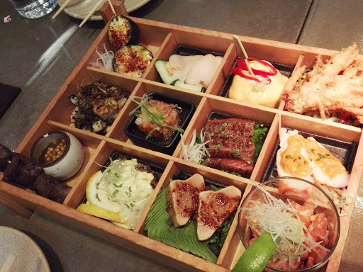I love it here at Union Sushi. The decor is absolutely amazing! I love the street art on the walls. Theres happy hour from 4-6:30pm in their Up Bar where you can get $1 oysters, $2 skewers, and more. Since they are a sushi and barbeque bar, I always try to get some sushi and some bbq. I like the black rice sampler which has a variety of fish including spicy tuna and eel. I prefer the black rice, because you dont have to douse it in soy sauce. And its more chewy and tastier than white or brown rice. Also, for $5 more you can ask for the real wasabi which is suppose to be wonderful. (When I try to ask for it, they ran out for the day). I also love the skewer items from the robata grill. There are a variety of meat and veggies that come out crispy and tasty. The grilled squash is cover in spicy lemon powder and absolutely made that squash taste like heaven. Also, do not forget dessert, especial if Pumpkin Mochi cake with cream cheese filling is on the menu. Im not a big fan of pumpkin, but this one melted in my mouth. The cake was creamy, the cream was delectable, and the pumpkin mochi was divine. It makes my mouth watered just writing it down.
