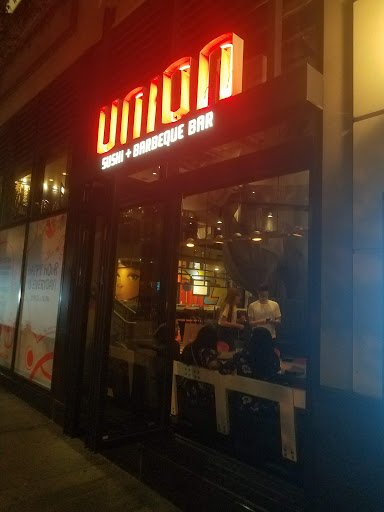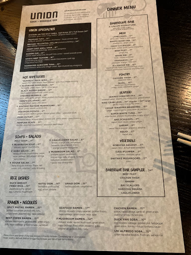 This place is cool. Like trendy cool and like you want to be there on a busy night to feel like a cool dude. The modern industrial look suits this place well. The highlight of the space is the barbeque grill centered in the restaurant. Here, youll see the head griller doing his thing. Its quite amazing that the place doesnt smell of BBQ and you wont a hint of smoke anywhere in the joint unless you stick your nose way into the awesome venting system theyve got going on. The food is good but if youre a sushi traditionalist you may find that the rolls are a bit sauce heavy. That said, there are some inventive rolls on the menu and theyre worth trying out. Particularly, the black rice is tasty and unique. The grill is quite good but youll get a varying degree of "is this cooked" to "this is overdone" depending on the day. As far as the BBQ goes, flavors are spot on. On my last visit with one other stomach, I did both the black rice sushi sampler as well as the BBQ sampler. I got a little bit of everything and left satisfied in the belly. There are specials on a fancy iPad mini that gets circulated around. How cool is that? Definitely be on the lookout for dessert specials. These may not be on the iPad mini or the menu. Its definitely worth asking if chef has anything special going on. Drinks? Drinks here are good and flavorful but dont seem especially generous with the alcohol. If youre a sake person, there are definite good picks on the menu. Would I come back? For sure. *Especially* if its during their happy hour time. Some great deals are to be had. Even if not happy hour, Union delivers on providing an above average tasty meal with an on average price for the area.