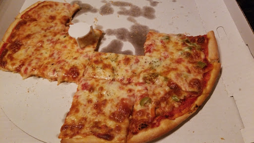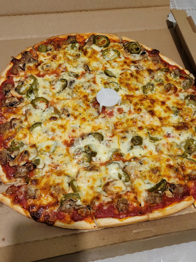 Weve eaten from here twice. The pizza is really cheesy and good. Its middle of the road in terms of price for a cheese pizza, but the extra toppings are a little costly (something like $2.25 each on a large). It comes with a free two liter, but last time they didnt ask us what type we wanted and just brought an RC cola. The drivers and the person answering the phone have been cool.