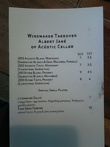 What a hidden gem! I got a ride from a friend to meet another friend and we passed by at least three times before we saw the sign demarcating the building, but once inside, I felt instantly at home. So much wine! So much good food! It was a Friday night and I arrived right after work, so the place was empty. But by the time my friend arrived a half hour or so later, the place was becoming crowded and lively banter filled the dining space. Looks small on the outside but its like an optical illusion and theres an upstairs party room for special events. Go to Websters to eat, drink and be merry!