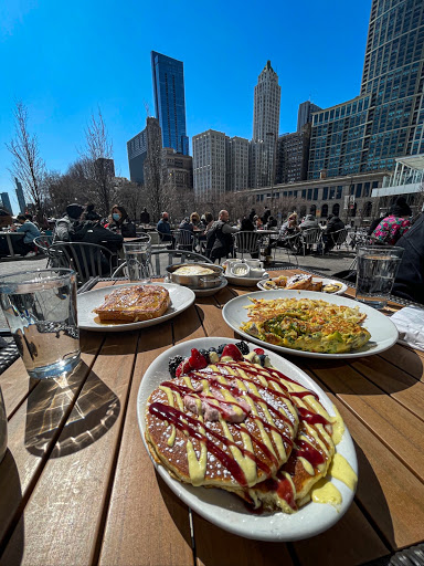 Arrived at the restaurant 9:45AM on Sunday, and there was a line outside the restaurant to put the name on the wait list. The wait time was about 45-60 minutes. To pass the time we went to the Millennium Park across the street to people watch at Cloud Gate sculpture area. We went back to the restaurant, and promptly waiter took us to a table. We ordered Classic Eggs Benedict and Signature Berry Bliss Pancakes; Both dishes were excellent, but the five stacked pancake with mound of fresh berries is a must order item on the menu. Eggs Benedict with huge cuts of smoked ham on perfectly poached eggs topped with creamy Hollandaise Sauce was excellent. And, it came with a side of crispy Hashbrown. Again, Eggs Benedict dish was a stomach busting portion for me to finish. TIP: Put your name on the list first then go enjoy Millennium Park because theyll text you when your table is ready. One more thing: Their estimated wait time was exact as stated, because I over heard several other diners mentioning to the front desk staff that their 45 minute was exactly to a second. You can also use an App, "Nowait Guest" to put yourself on the wait list, but the reviews are mixed from users. If you are adventurous, go to Apples App Store and search for "Nowait Guest" Good Luck!