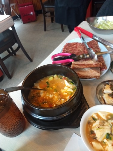 What a fun experience! Come hungry because it is a lot of food. I recommend going with a group of friends and sharing all sorts of meats. They come with pickled vegetables in small plates that are delicious. The vegetable pancake is really good, but I wasnt a big fan of the soups. if you are into trying a new drink, a shot of their peach liquor was very tasty. A great place for a large group of people!!