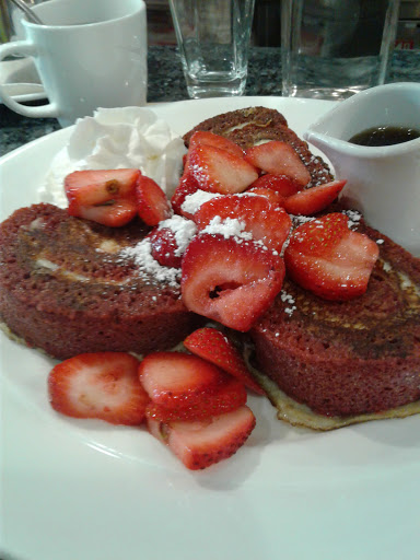 Yolk, how do I love thee. This place has some seriously good breakfast food. Lovely poached eggs, spicy chorizo, chipotle spiked hollandaise on top of a toasted English muffin - so good! All of the eggs benedict plates come with fruit salad. Legit fruit salad. Not 2 cubes of honeydew and cantaloupe but a bunch of grapes, fresh orange slices, and fresh pineapple. Because we wanted to be heffa status we also ordered red velvet french toast to share - slices of red velvet cake swirled with cream cheese frosting french toasted and served with fresh strawberries and whipped cream. *DEAD* Refuse to eat red velvet cake any other way now. Service is friendly and attentive and no lines on the weekday for this location.