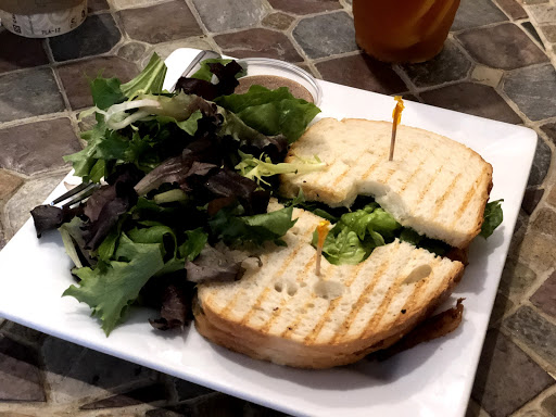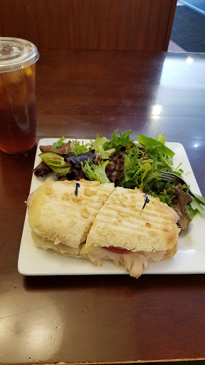 Im reviewing this as a coffee shop, but its a bit stronger as a lunch place. About 10 booths and tables. No outlets. Jazz at good (low) volume on the audio. Free wi-fi with password. Some random photos on wall - place definitely needs an atmosphere transplant. Tea is Stash bags. Chai is Oregon-opposite-of-chai. Small selection of Big menu of sandwiches and salads, plus ice cream and shakes.