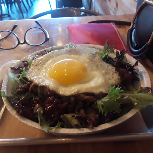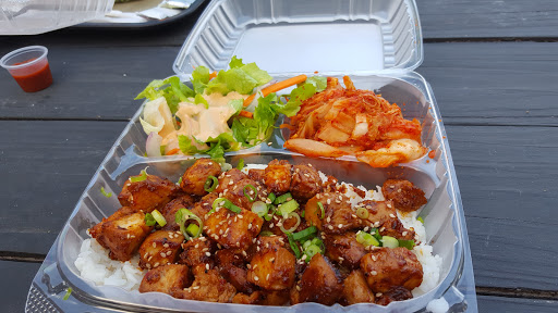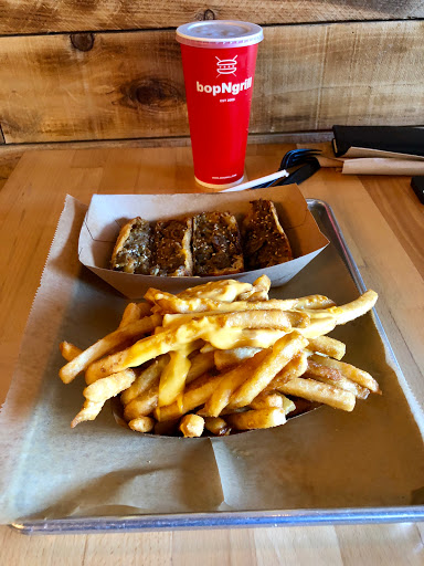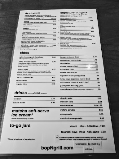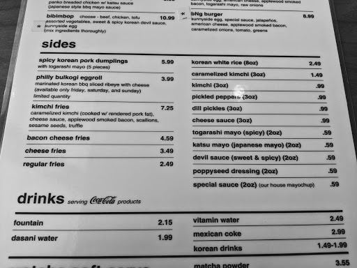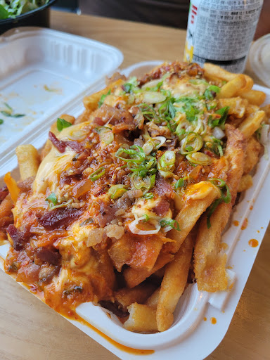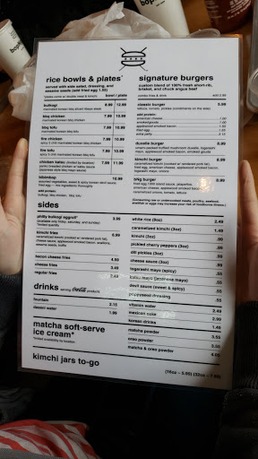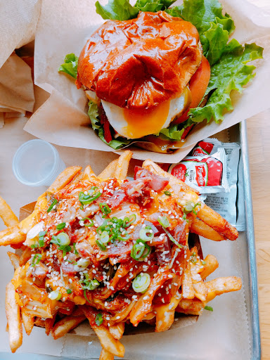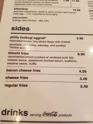 Korean Fusion...GREAT Kimchee fries! Share them. I did suggest to cashier that they chop their kimchee into more bite sized pieces so one could get a little taste with each fry rather than a huge chunk at once. I had their beef bi bim bop. I have had better. Not a huge fan of lettuce with mine or the american ingredients (onions, corn, etc.) One could ask them to emit, but I didnt have my reading glasses on and didnt know what was included. My daughter ordered the chicken fingers. I forgot to ask her how she liked them. They are huge and one could easily share them. Son ordered a "safe" burger. Will go back again. Next time, I am going to try a fun burger.