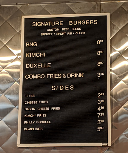 Okay I first want to say I am writing this as an out of towner. I had duxelle burger, that was one of the best burgers I have ever had when they talk about umami they arent kidding. The fries were perfect crunchy and crispy on the outside and like mash potatoes on the inside. My brother got the bulkogi plate which was awesome tender and flavorful. The kimchi while not home made adds a great sour note to the food. Try the kimchi fries. The next day we both went got fire chicken which was nice and spicy. My brother got the katsu nice and crunchy with a great sauce. Finally get the egg rolls best I have ever had a great interpretation on a classic appetizer. TLDR if you like burgers get the duxelle if you want something new and spicy get the fire chicken. Split kimchi fries and get the egg roll of they have it.