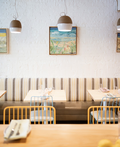 mfk is small, quiet, cool, great service and the food is fresh, flavorful and delicious. Our new favorite spot. Drinks are great too. Sitting at the bar for dinner is a fun casual way to go.