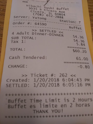 The buffet choices were ok, but they did not refill the empty stations. They close @ 10pm, we arrived at 7:45pm, so they should have put more food out. The white rice was hard. The sushi and hibachi were average, not very fresh(the fish looked a little dried out). One of the workers DID NOT wash their hands when they left the restroom. Found that quite gross. The decor is regular and its pretty clean. I love a good buffet, but I wont be returning to this one.